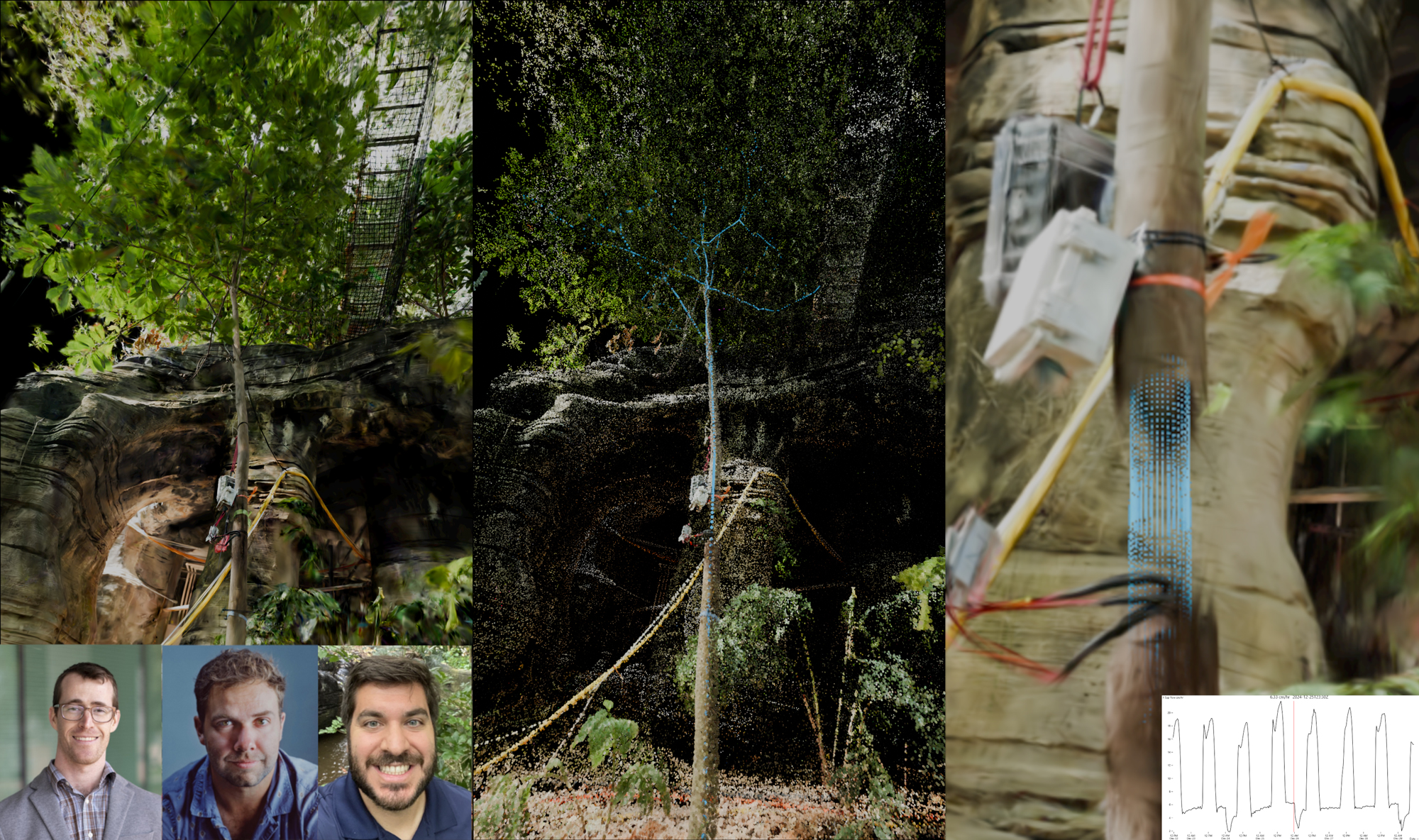 Visualization consultant Devin Bayly (left), Wonder Studio media lead Aaron Bugaj (center), and researcher Justin Bestily (right) worked on data visualization to explain the research done on a cacao tree being studied in the Biosphere 2 Rainforest. This includes a 3D re-creation of the space from multiple photos, an animation of a simulation of the tree and of its water flow, and a cross section with the exterior of the branch removed to show the water flow just above the sensor, synced with the actual data collected.